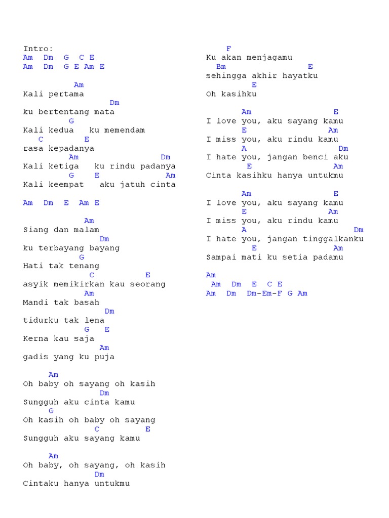 D F G F G Bm A Em B Fm Cm Gm E C C D Dm Am Fm Chords for Ku Rela Dibenci Permata Cinta LIVE Showcase AJL31 - Aiman Tino with song key BPM capo transposer play. Pin By Zuri On Pianika Pianika Lagu Buku Lagu Ashral Hassan - Oh Cinta Oh Sayang. Ku sad ar cinta tak selaman ya bersatu Bagai bayang-bayang dengan badanku Meng arungi samud era cin ta bukannya hal yang biasa Tak semudah m engucapkan j anji.